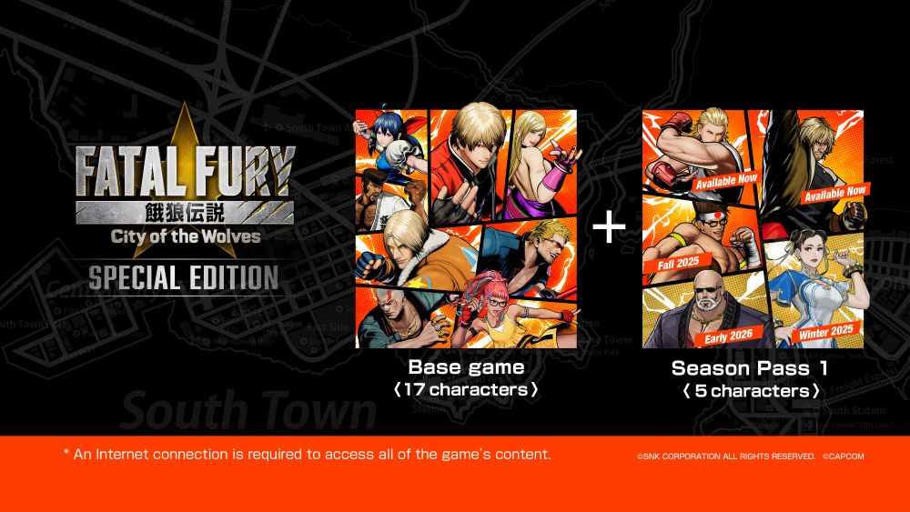 以DLC角色“东丈”为首,包含《街头霸王》系列的“肯”“春丽”等角色的“季票1”于一体的游戏套装“饿狼传说:群狼之城 SPECIAL EDITION”,正在好评发售中!